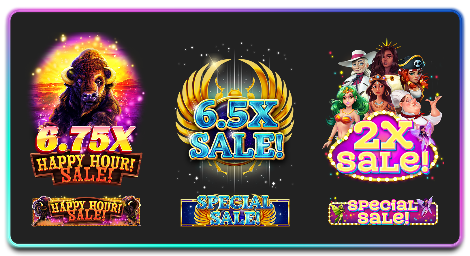I worked with product and marketing to create marketing starter packs for each new slot, releasing on a 2 week cadence. I designed within established templates, using new slot art collateral to create new concepts yet retaining recognizable layouts for players.