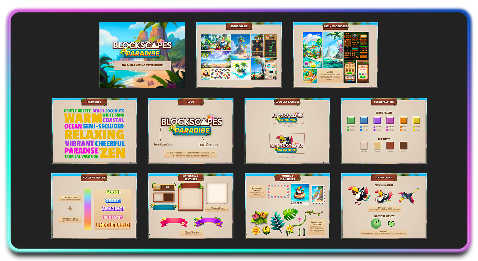 While working as the lead artist for all social media and community outreach, I created Brand Guides to help solidify each games look, feel, and brand for all social media endeavors. I also created individual Powerpoint and Figma templates for each game so they could be utilized by other departments for their own presentation needs.