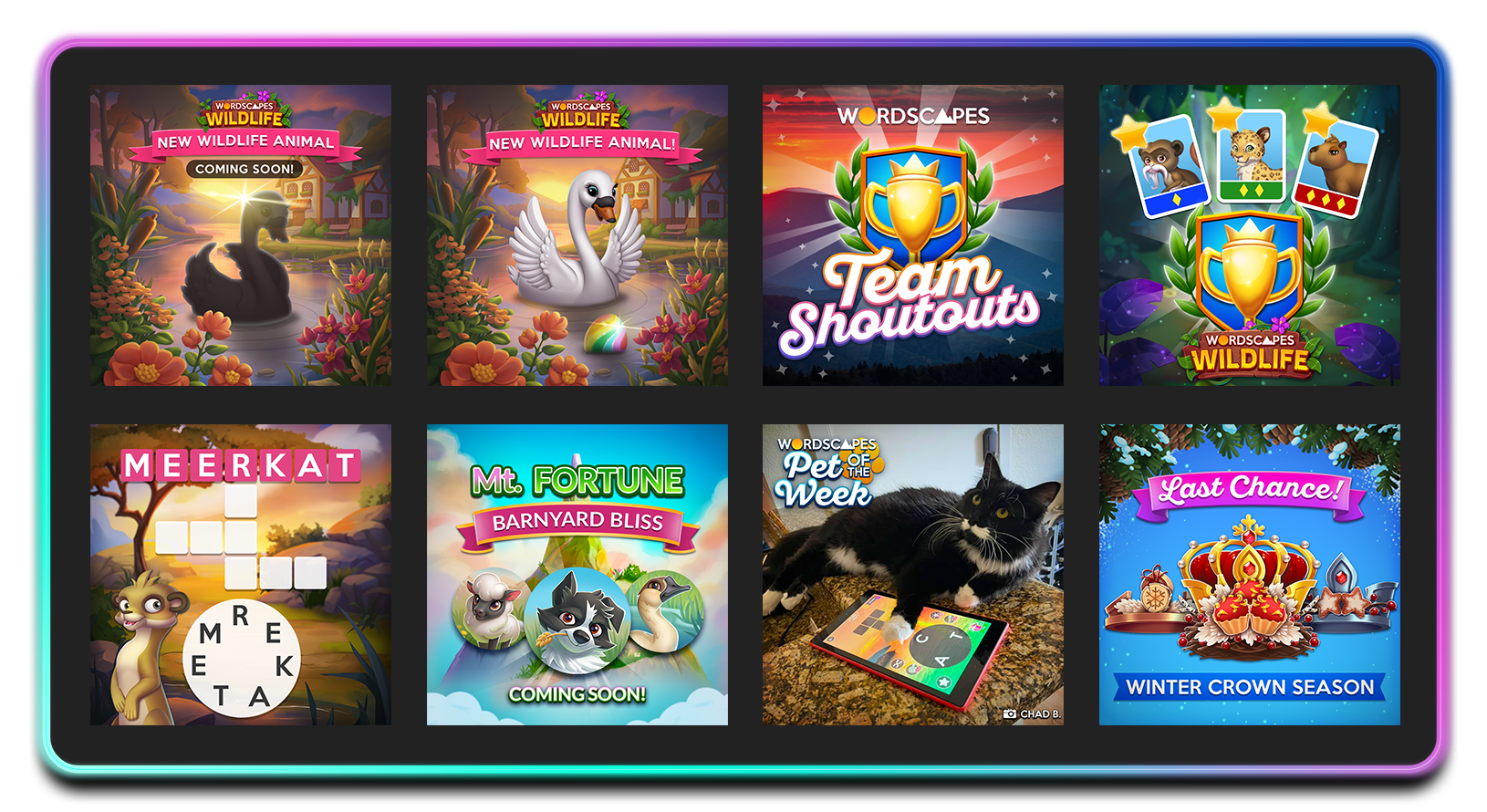 I enhanced Wordscapes community artwork by creating multiple templates for different posts, resulting in more assets to be created on a shorter cadence with larger audience participation. In addition to regular content, I collaborated with the social media manager to create FAQ posts for new game features to help players understand how to interact with them. This resulted in more players interacting with the features, and less confusion over how the feature benefits players.